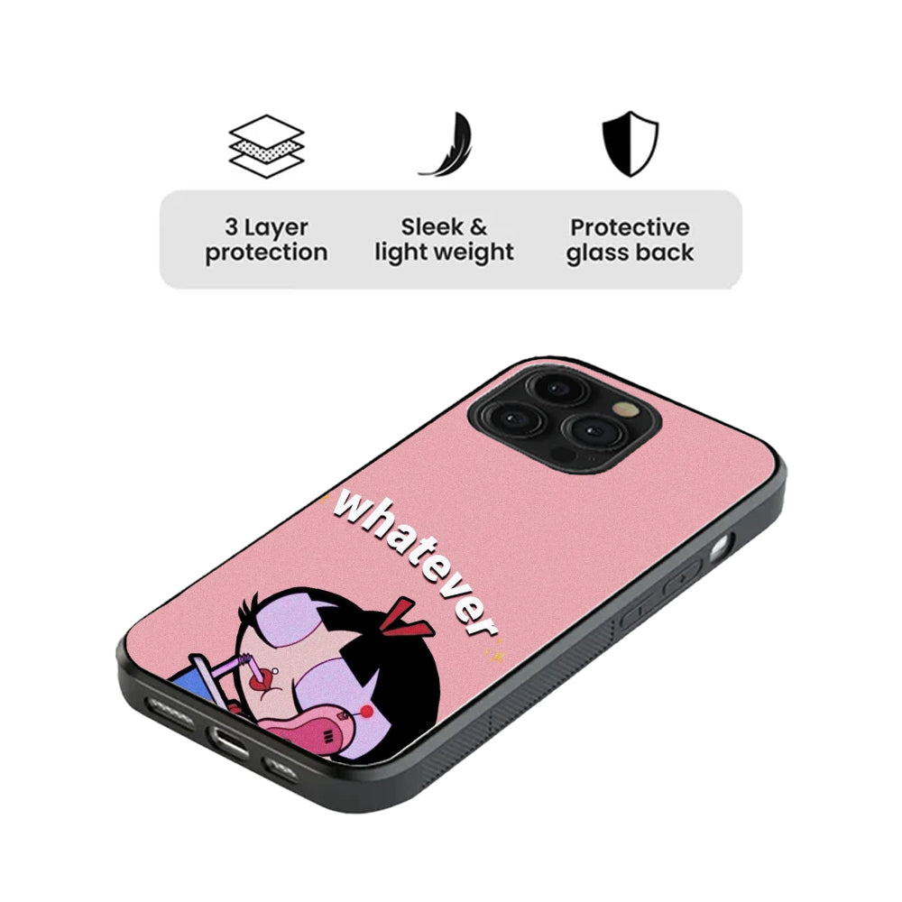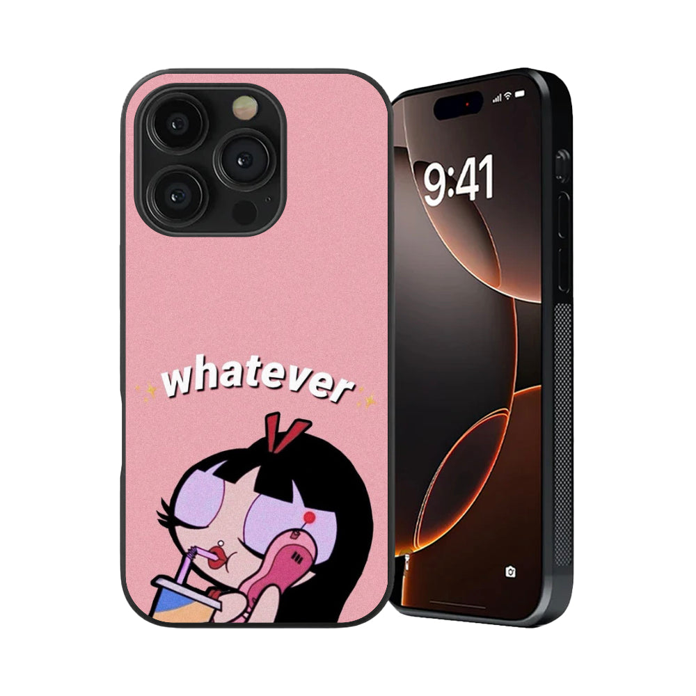The design is a masterclass in high-contrast, "soft but sharp" aesthetics. Set against a grainy, vintage-pink canvas, Blossom is caught in a moment of pure, nonchalant focus—on the phone, sipping her drink, and completely tuned out. With the bold white "whatever" typography and shimmering stars, it captures the ultimate power move: absolute indifference.