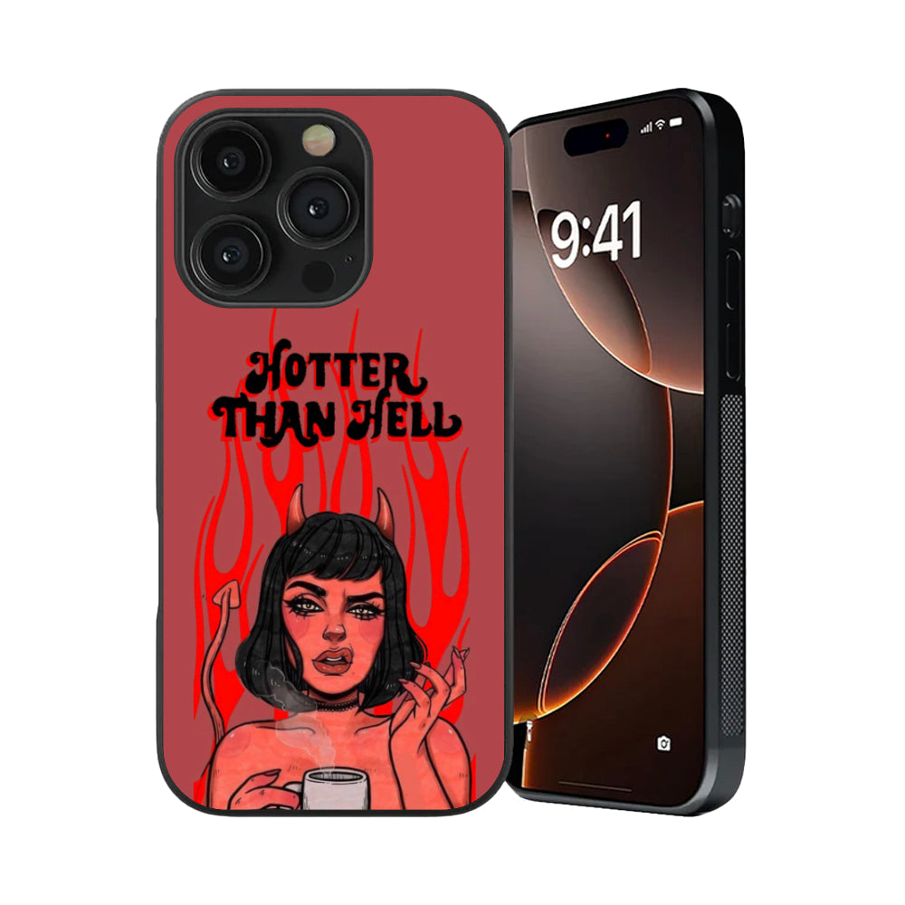 The design is a masterclass in retro-rebellion. It features an unbothered infernal icon, horns high and eyes sharp, casually sipping from her mug against a backdrop of rising, red-hot flames. With the bold, psychedelic "HOTTER THAN HELL" typography cutting through the muted crimson canvas, it captures that perfect blend of vintage attitude and modern street-style heat.