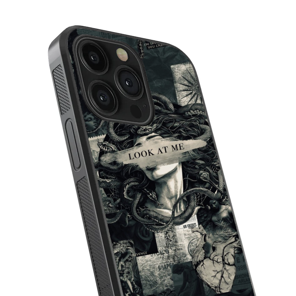 The design is a masterclass in "Dark Academia" and vintage-grunge aesthetics. It features a striking portrait of Medusa, her eyes provocatively obscured by a rough brushstroke bearing the command: "LOOK AT ME." Surrounded by a chaotic symphony of anatomical hearts, ancient compasses, and weathered newsprint, it captures the raw, unfiltered soul of a legend that refuses to be ignored.