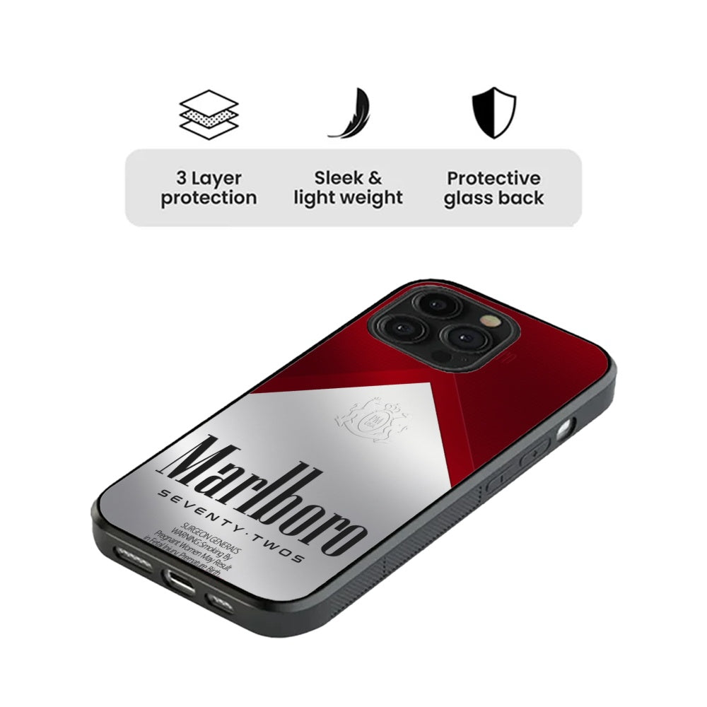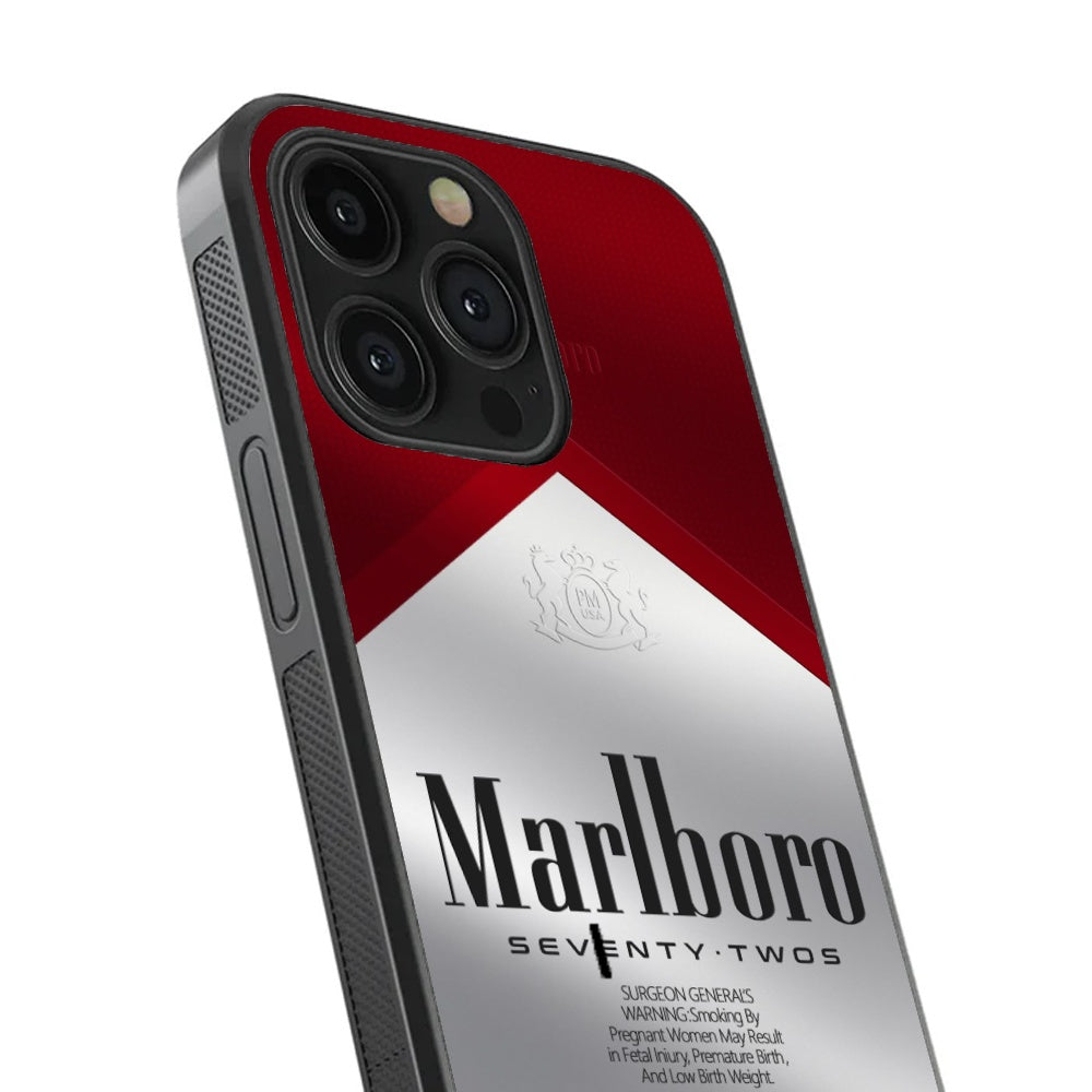 Marlboro, the iconic and globally recognized tobacco brand. Known for its signature red, white, and silver chevron design, it symbolizes classic Americana, rugged individualism, and a timeless, rebellious spirit. The bold, clean graphic replicating the "Seventy-Twos" pack captures a distinct retro aesthetic and the unfiltered attitude of classic branding.